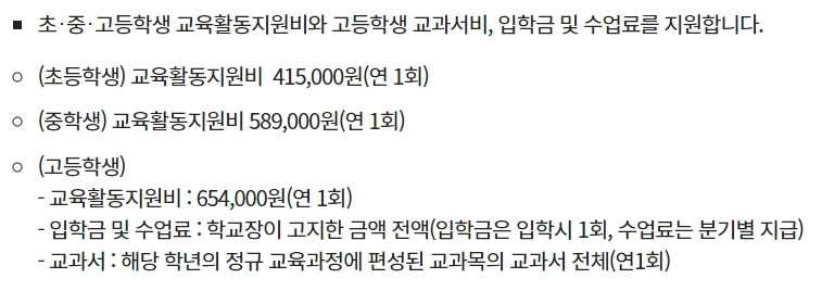 정부에서 지원하는 정부 바우처로 저소득층 학생들의 교육 보장과 교육비 부담을 줄이기 위해 교육 급여를 시행하고 있습니다. 기존 교육급여는 현금으로 지급이 되어왔지만 2023년이 되고 바우처로 변경이 되었습니다.