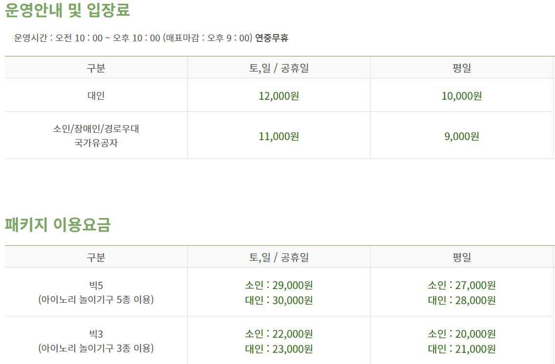 입장료 : 대인 10,000원(평일), 12,000원 (토, 일/공휴일)